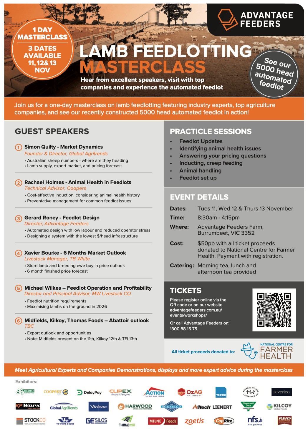 Gerard Roney spoke to us on our new "End of Message" podcast yesterday about his Farming operation and the season. He is also running 3 × 1-day Lamb Feedlotting Masterclasses in November. These are great events and I am booked in to go on the Wednesday. See the flyer at the bottom of the page.